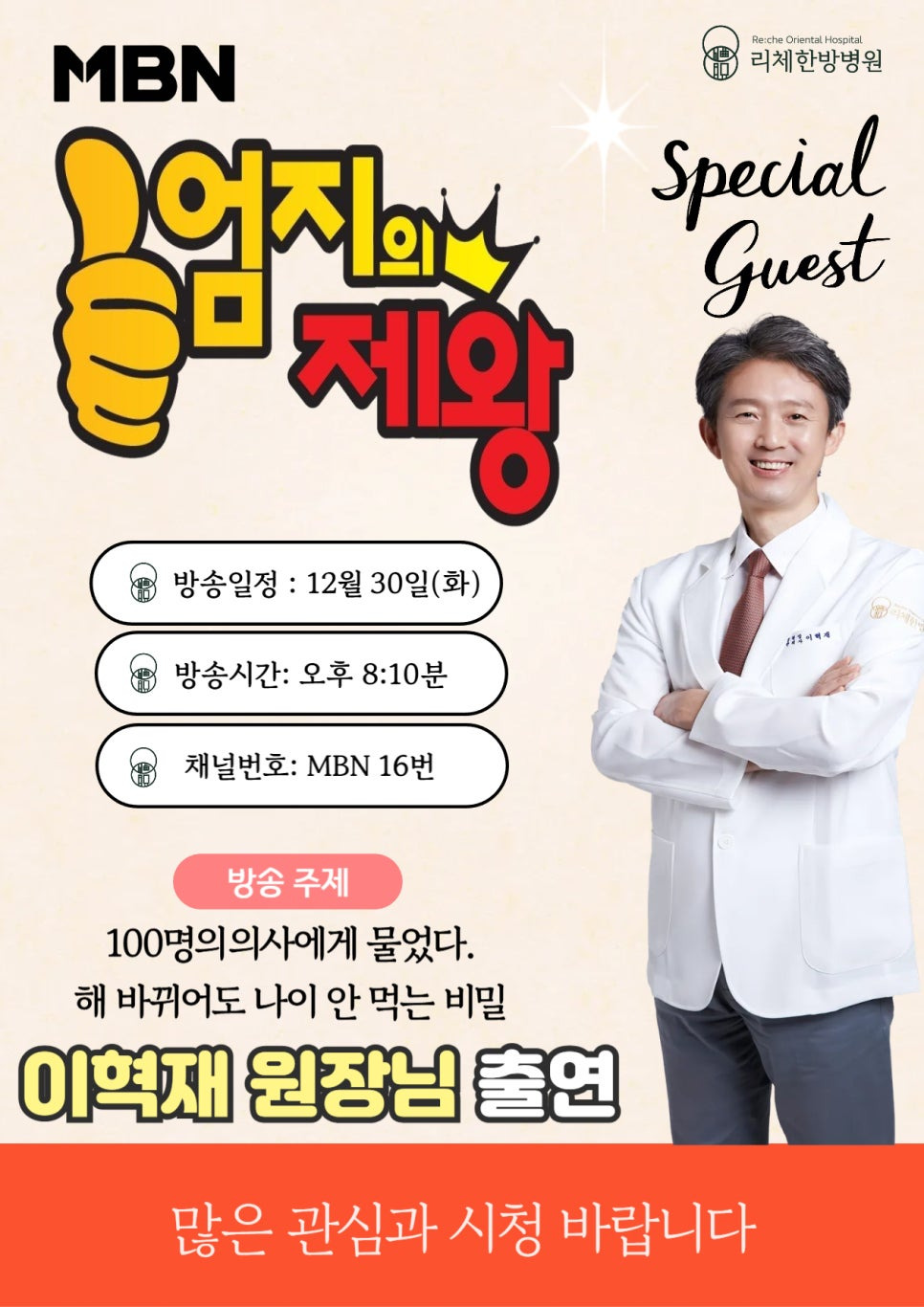[원장님 방송출연] MBN 엄지의 제왕 12월 30일 화요일 이혁재 병원장님 출연 안녕하세요😊리체한방병원에서 반가운 소식을 전해드려요!리체한방병원 이혁재 병원장님이MBN 〈엄지의 제왕〉에 출연합니다!🕗 12월 30일(화) 저녁 8시 10분📡 MBN 채널 16번🎯 방송 주제100명의 의사에게 물었다!해 바뀌어도 나이 안 먹는 비밀시간은 흘러도건강한 몸과 젊음을 지키는 방법,방송을 통해 직접 확인해 보세요.📌 12월 30일 화요일 저녁 8시 10분,MBN 〈엄지의 제왕〉 본방 사수!많은 관심과 시청 부탁드려요💛 리체한방병원/원장님 강의 및 방송 2025.12.23